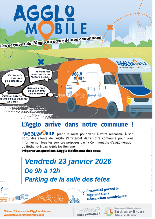Le bus de l’agglo sera sur le parking de la salle des fêtes le vendredi 23 janvier 2026 de 9h à 12h.