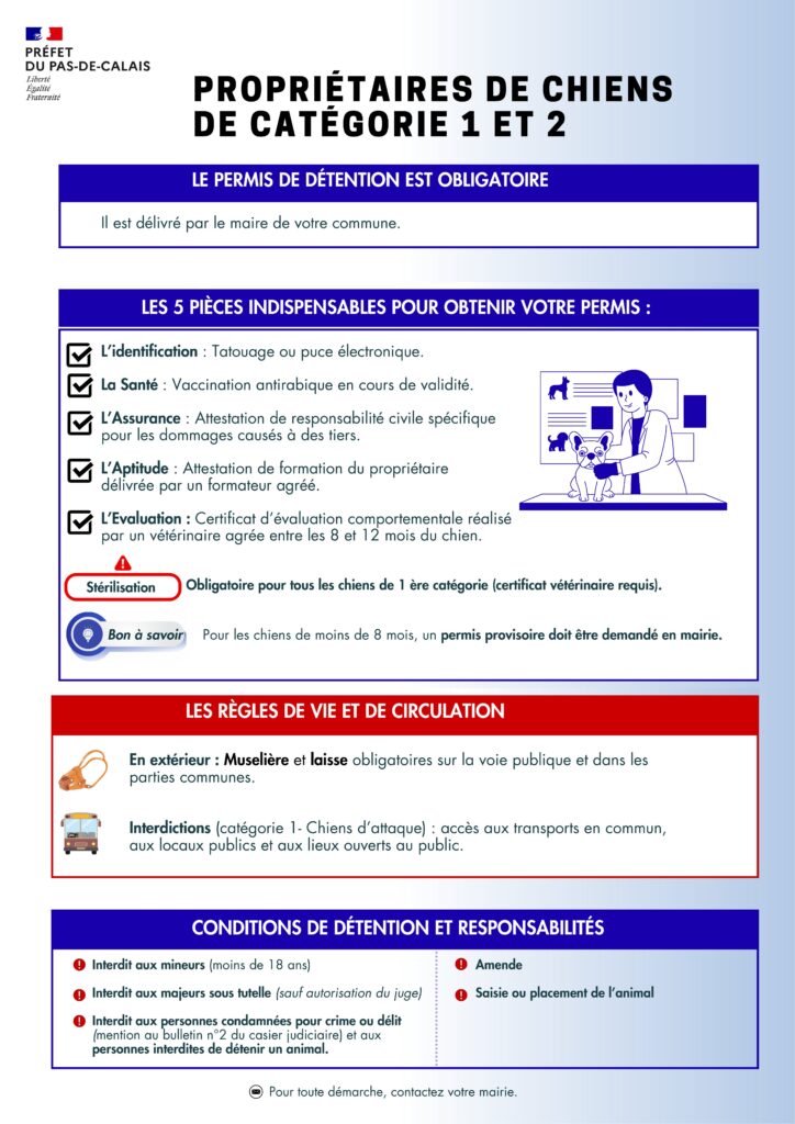 La préfecture du Pas-de-Calais rappelle les obligations réglementaires relatives à la détention des chiens catégorisés : Les propriétaires de chien de 1ère et 2e catégorie sont soumis à l’obligation de détenir un « permis de détention ».