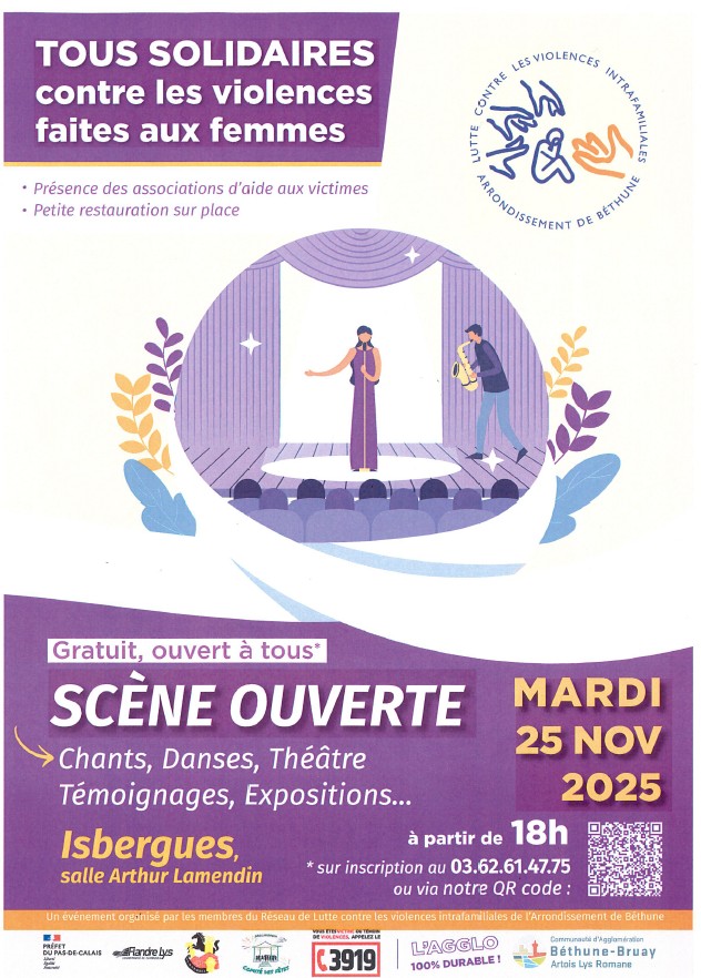 A l’occasion de la journée internationale de lutte contre les violences faites aux femmes, le 25 novembre prochain, le RÉSEAU VIF de l’arrondissement de Béthune organise une scène ouverte à ISBERGUES, Salle Arthur Lamendin.