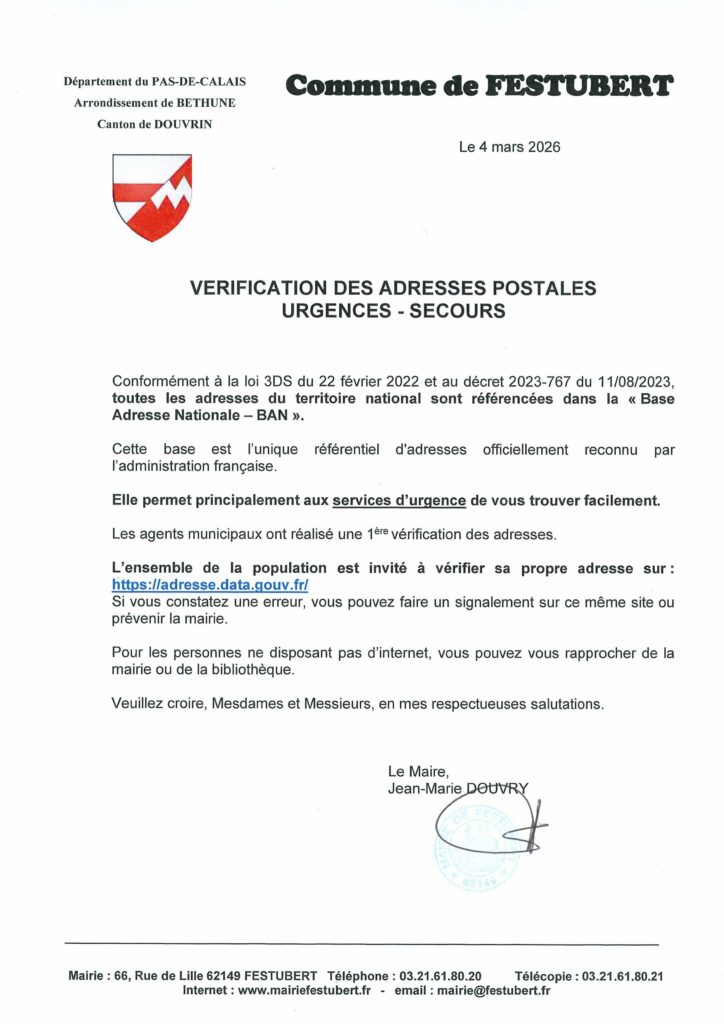 L’ensemble de la population est invité à vérifier son adresse postale sur le lien : adresse.data.gouv.fr